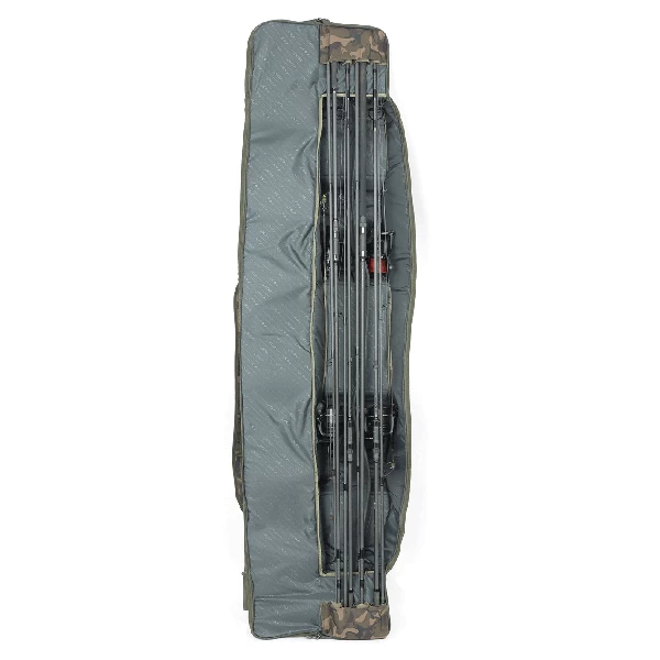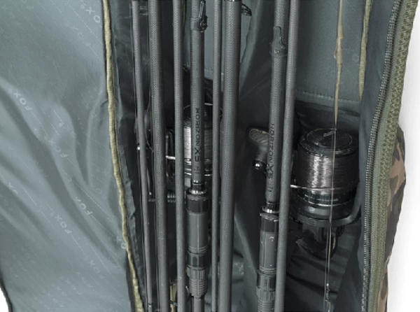 The Fox Camolite Rod Case is available in several variants. Fox comes with a beautiful series of rod cases: The Fox Camolite Rod Cases. They come in three lengths: 166, 197 and 214cm. There are two versions, one for four rigged rods (2+2) and one for six rigged rods (3+3). These Rod Cases are designed to provide space for your sets, even if they are equipped with large guides and big pit reels. Still, the look and feel is sleek. The case is reinforced with PU board on the most important points, such as the reel and the guides. The handles of the rods go into padded caps and the tips are secured with Velcro. In addition, these holdalls feature a large external pocket for your landing net, a reversible padded shoulder strap, reinforced EVA handles and heavy duty double zippers. The 197 and 214cm versions have convenient storage pockets for small equipment. Just count and measure your rods and you know which Fox Camolite Rod Case you need!