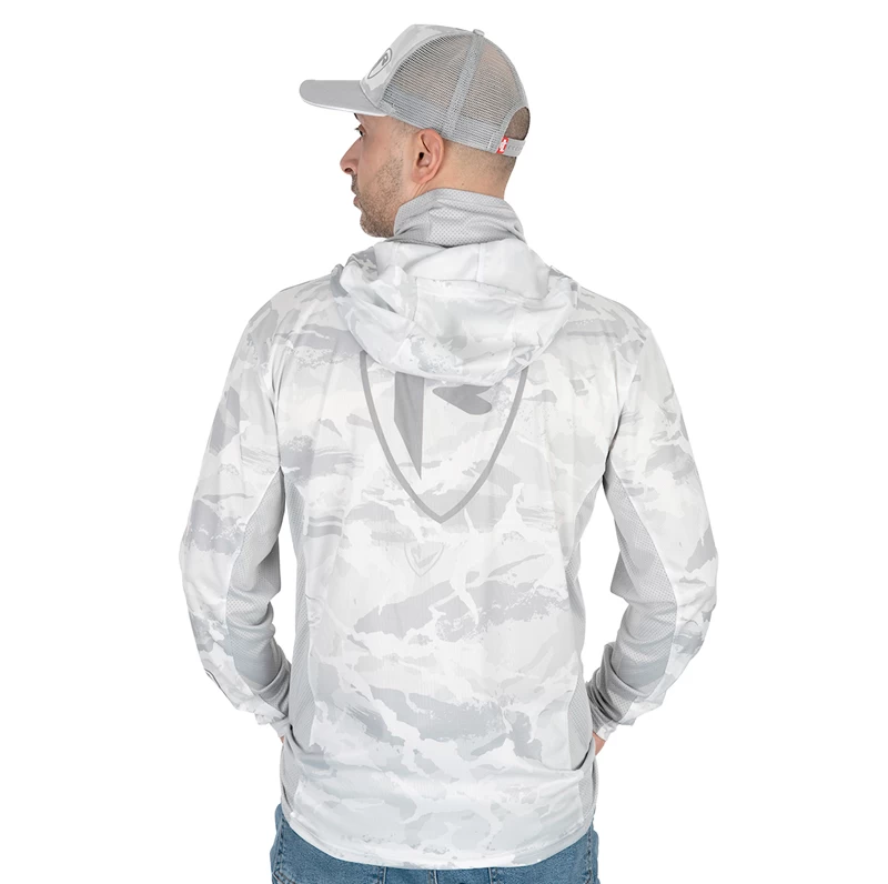 Made of lightweight, breathable material, this Fox Rage UV Hooded Performance Top provides the perfect sun protection for your upper body during the summer months. The shirt features a built-in, ventilating collar for nose and lower face protection, and the hood offers full head protection from the sun, including ears and neck. Finished in new Fox Rage light camo design and available in several sizes.